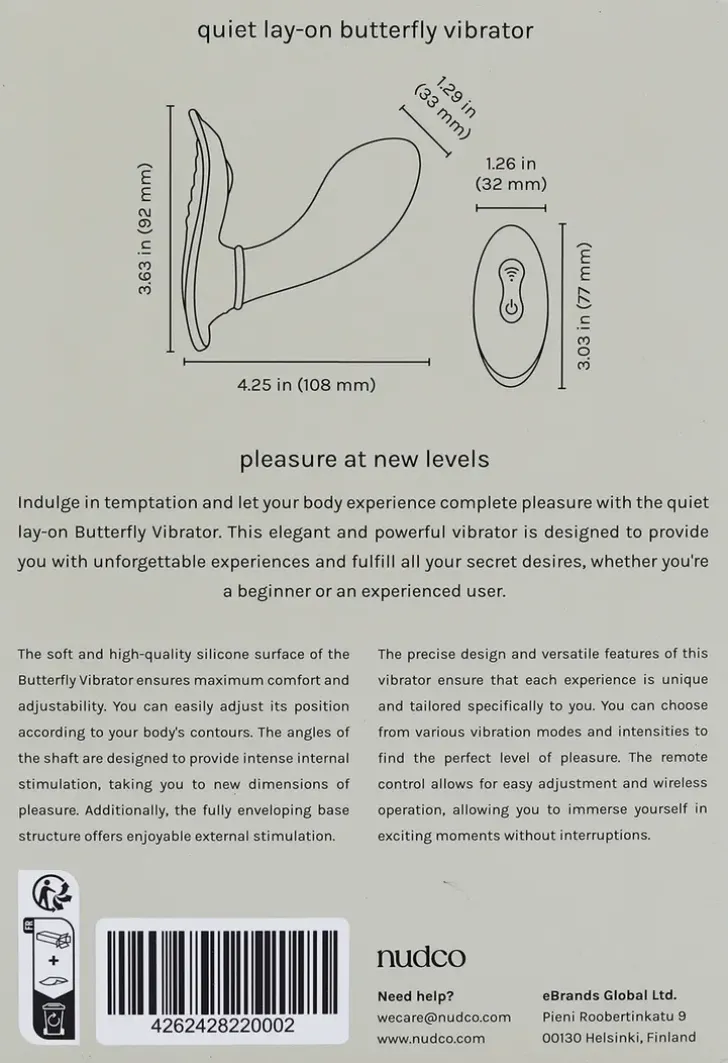 Hiljainen Lay-On Butterfly-Vibraattori – Nautintoa Uusilla Tasoillaheittäydy Kiusaukseen Ja Anna Kehosi Kokea Täydellistä Mielihyvää Hiljaisen Lay-On Butterfly-Vibraattorin Avulla. Tämä Elegantti Ja Tehokas Vibraattori On Suunniteltu Tarjoamaan Sinulle Unohtumattomia Kokemuksia Ja Täyttämään Kaikki Salaiset Toiveesi Olitpa Sitten Vasta-Alkaja Tai Kokenut Käyttäjä.Pakkauksen Sisältö:X1 Lay-On Butterfly-Vibraattorix1 Kaukosäädinx1 Usb 3.0 Laturi Kaapelix1 Käyttöohjeetominaisuudet:- 9 Eri Tehoa Hennosta Kosketuksesta Luojalliseen Kokemukseen- Hiljainen- Vedenkestävä- 5-10 Metriä Sädettä Kaukosäätimen Ohjaamiseen- 1,5H Nautinnolllista Hetkeä Täyslatauksellabutterfly-Vibraattorin Pehmeä Ja Korkealaatuinen Silikonipinta Takaa Maksimaalisen Mukavuuden Ja Säädettävyyden. Voit Helposti Muokata Sen Asentoa Juuri Sinun Kehosi Muotojen Mukaan. Varren Kulmat, On Suunniteltu Tarjoamaan Intensiivistä Sisäistä Stimulaatiota, Joka Vie Sinut Uusiin Ulottuvuuksiin. Lisäksi Täysin Peittävä Pohjarakenne Tarjoaa Nautinnollista Ulkoista Stimulaatiota.Tämän Vibraattorin Tarkka Muotoilu Ja Monipuoliset Ominaisuudet Takaavat, Että Jokainen Käyttökokemus On Ainutlaatuinen Ja Räätälöity Juuri Sinulle. Voit Valita Erilaisista Värinätiloista Ja Intensiteeteistä Löytääksesi Täydellisen Nautinnon Tason. Kaukosäädin Mahdollistaa Helpon Säätämisen Ja Langattoman Käytön, Joten Voit Heittäytyä Kiihottavan Hetken Vietäväksi Ilman Keskeytyksiä.Butterfly-Vibraattorin Akku Latautuu Nopeasti Ja Tarjoaa Jopa 1,5 Tunnin Nautinnon Täydellä Latauksella. Voit Siis Nauttia Pitkistä Hetkistä Intohimoa Ja Nautintoa Ilman Huolta Akun Tyhjenemisestä.Tämä Vibraattori On Helppo Puhdistaa Ennen Ja Jälkeen Käytön. Käytä Mietoa Saippuavettä Tai Seksilelujen Puhdistusainetta Varmistaaksesi, Että Se On Aina Hygieeninen. Suosittelemme Myös Käyttämään Vesipohjaista Liukuvoidetta, Jotta Kokemus Olisi Vielä Miellyttävämpi Ja Liukkaampi.Huomioithan, Että Butterfly-Vibraattoria Tulee Käyttää Vain Ulkoisesti Tai Emättimen Sisällä. Älä Käytä Sitä Peräaukossa Tai Muissa Ruumiin Aukoissa, Koska Se Voi Aiheuttaa Vahinkoa Tai Epämukavuutta. Tämä Vibraattori On Tarkoitettu Ainoastaan Aikuisille Eikä Sitä Tulisi Käyttää Raskauden Aikana Tai Jos Sinulla On Jokin Lantion Alueen Tai Sukuelinten Sairaus. Jos Sinulla On Terveysongelmia Tai Olet Epävarma, Suosittelemme Keskustelemaan Lääkärin Kanssa Ennen Tuotteen Käyttöä.Tee Jokaisesta Hetkestäsi Unohtumaton Ja Anna Butterfly-Vibraattorin Tuoda Intohimon Siivet Elämääsi. Tilaa Omasi Tänään Ja Valmistaudu Astumaan Uskomattomien Nautintojen Maailmaan!Tuotteen Puhdistaminen Ja Säilyttäminen:1. Puhdista Tuote Lämpimällä Vedellä Tai Miedolla Saippuavedellä2. Kuivaa Tuote Puhtaalla Pyyhkeellä3. Säilytä Tuote Viileessä, Kuivassa Ja Puhtaassa Tilassa.4. Älä Koskaan Puhdista Tätä Tuotetta Orgaanisella Puhdistusaineella, Joka Sisältää Alkoholia, Bensiiniä Tai Asetonia. Vältä Tuotteen Säilyttämistä Suorassa Auringonvalossa.Teknillinen Tieto:Vedenkestävämateriaali: Silikoniakun Kesto: 1,5Htäysilataus Kesto: 1,5Hväirnätiloja: 9Varoitus:- Lopeta Laitteen Käyttö Kun Tunnet Epämukavuutta- Lopeta Tuotteen Käyttäminen Mikäli Pinta On Epätasainen Tai Tuote On Rikki- Säilytä Tuote Lapsien Ulottuvilta