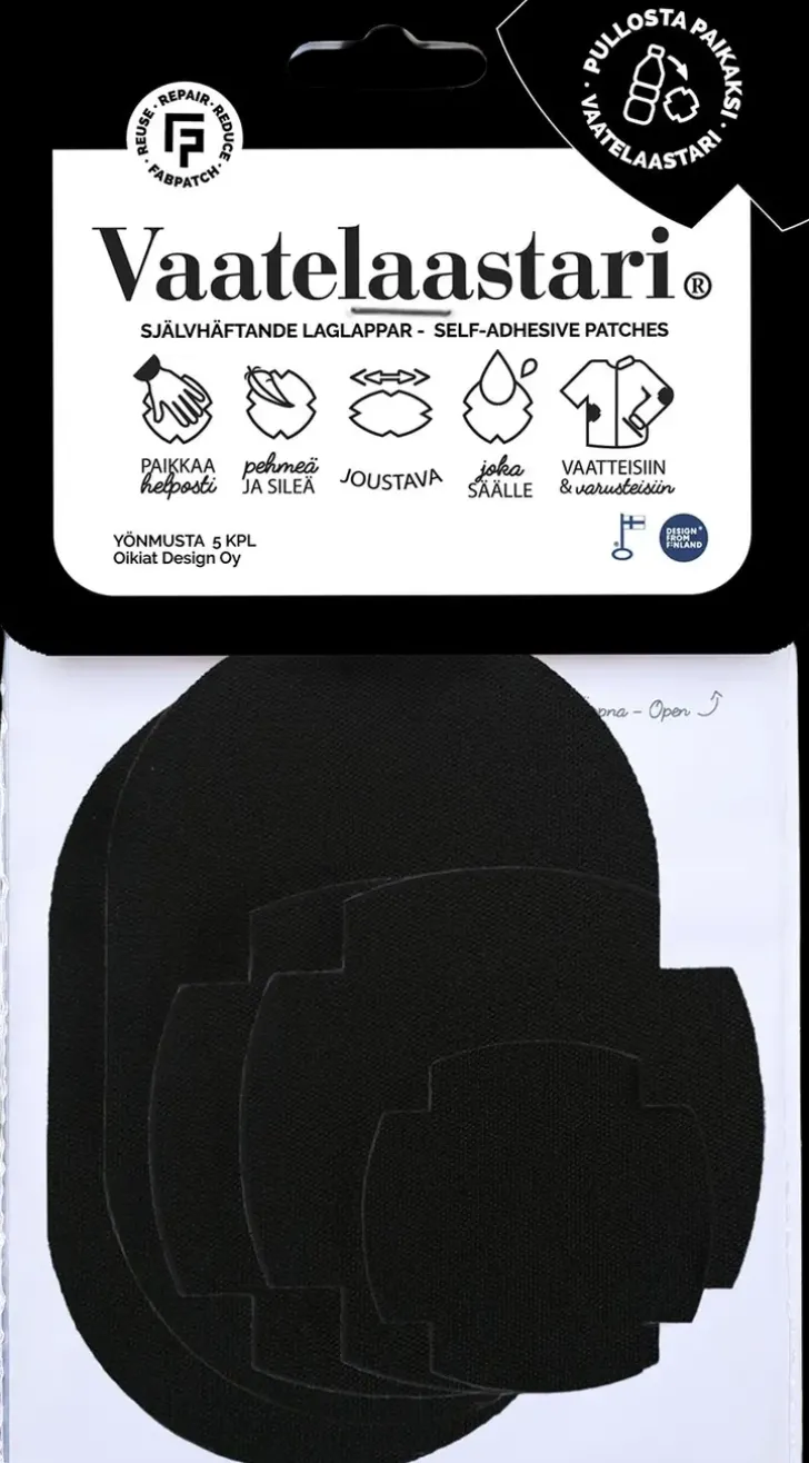 Fabpatch Vaatelaastari On Helppo Hankaamalla Kiinnittyvä Suomessa Valmistettu Tekstiilien Korjauspaikka. Tekstiilimateriaali On 100% Kierrätyspolyesteriä. Valmiiksi Muotoon Leikatut Paikat Ovat Kooltaan: 2 X Maxi 75X110Mm, 2 X Medi 70Mm, 1 X Mini 45X45Mm