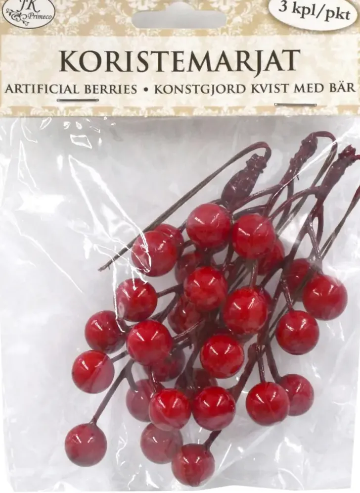 Koristemarjat Askarteluun Ja Koristeluun. Pakkaus Sisältää Kolme Kappaletta Marjaoksia, Joissa On Rautalanka. Yhden Oksan Pituus On Noin 15Cm.