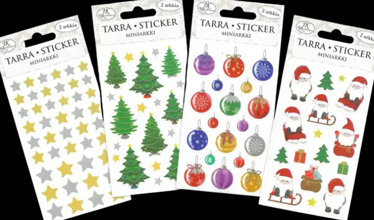 Mini Kuviotarrat Askarteluun Ja Koristeluun. Pakkaus Sisältää Kaksi Arkkia Paperisia Tarroja. Yhden Arkin Koko On 12,5Cm X 7,2Cm.