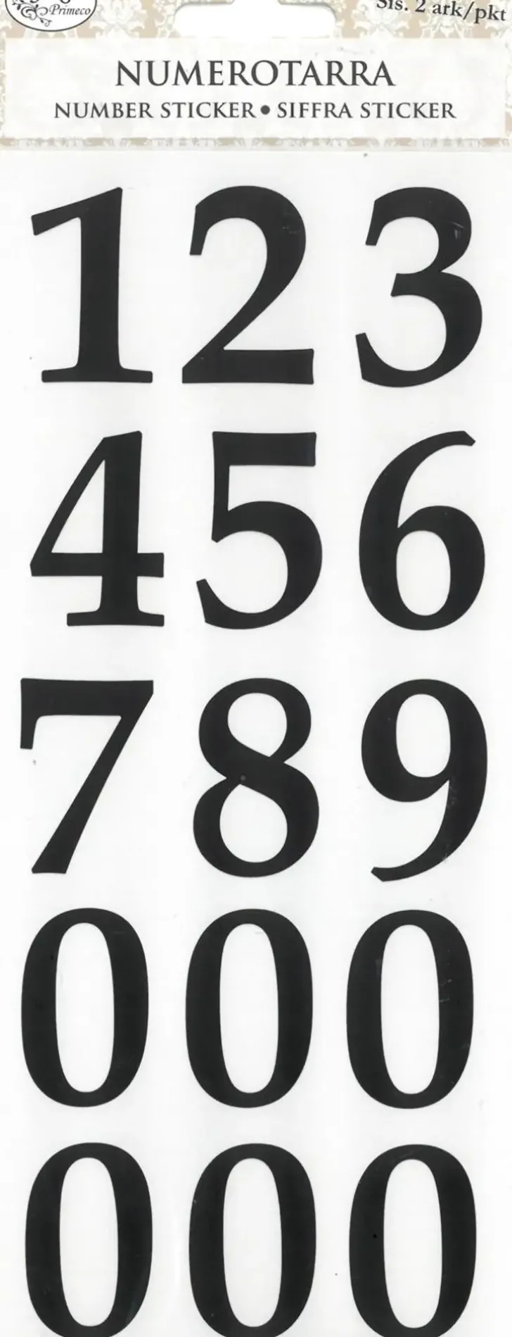 Numerotarrat Askarteluun Ja Koristeluun. Pakkaus Sisältää Kaksi Arkkia, Jossa On Muoviset Numerotarrat 0-9. Yhden Numeron Korkeus On N. 3,6Cm.