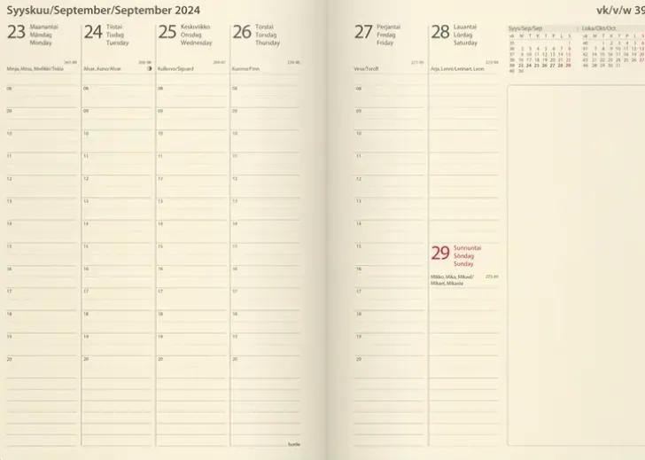 Keinonahkakansi, Kuminauhalla. Säilytystasku Takakannessa. Kalenterin Aukeamalla Yksi Viikko, Tuntijaotus 08-20, Palsta Muistiinpanoille, Kuluvan Ja Seuraavan Kuukauden Kalenteritaulukot. Kalenteri Sisältää Nimipäivät, Juhlapyhät, Liputuspäivät, Kuun Vaiheet, Vuosisuunnitelmat Kuluvalle Ja Seuraavalle Vuodelle Ja Runsaasti Muistiinpanosivuja. Kalenteriosa: Vk 52 2023-Vk 1 2025. Kolmikielinen: Suomi/Ruotsi/Englanti. Sidottu. Kermanvärinen Paperi. Koko: 148X210 Mm (A5).