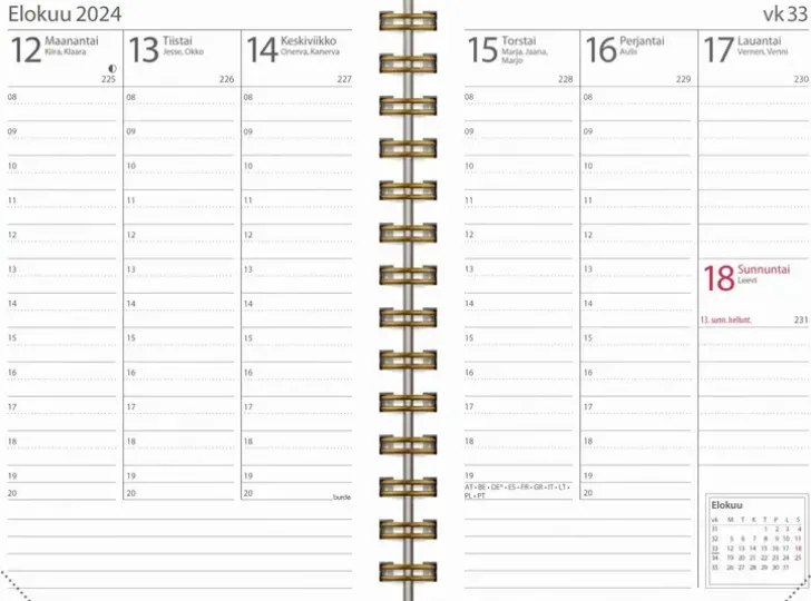 Painettu Keinonahkakansi. Kalenterin Aukeamalla Yksi Viikko, Tuntijaotus 08-20 Ja Kuluvan Kuukauden Kalenteritaulukko. Kalenteri Sisältää Nimipäivät, Kansalliset Pyhäpäivät, Liputuspäivät, Kuun Vaiheet, Kalendaariset Tiedot, Vuosisuunnitelmat Kuluvalle Ja Seuraavalle Vuodelle, Vuosiruudukot Kuluvalle Ja Seuraavalle Vuodelle. Kalenteriosa: Vk 50 2023-Vk 1 2025. Suomenkielinen. Parikierresidottu. Koko: 83X127 Mm.