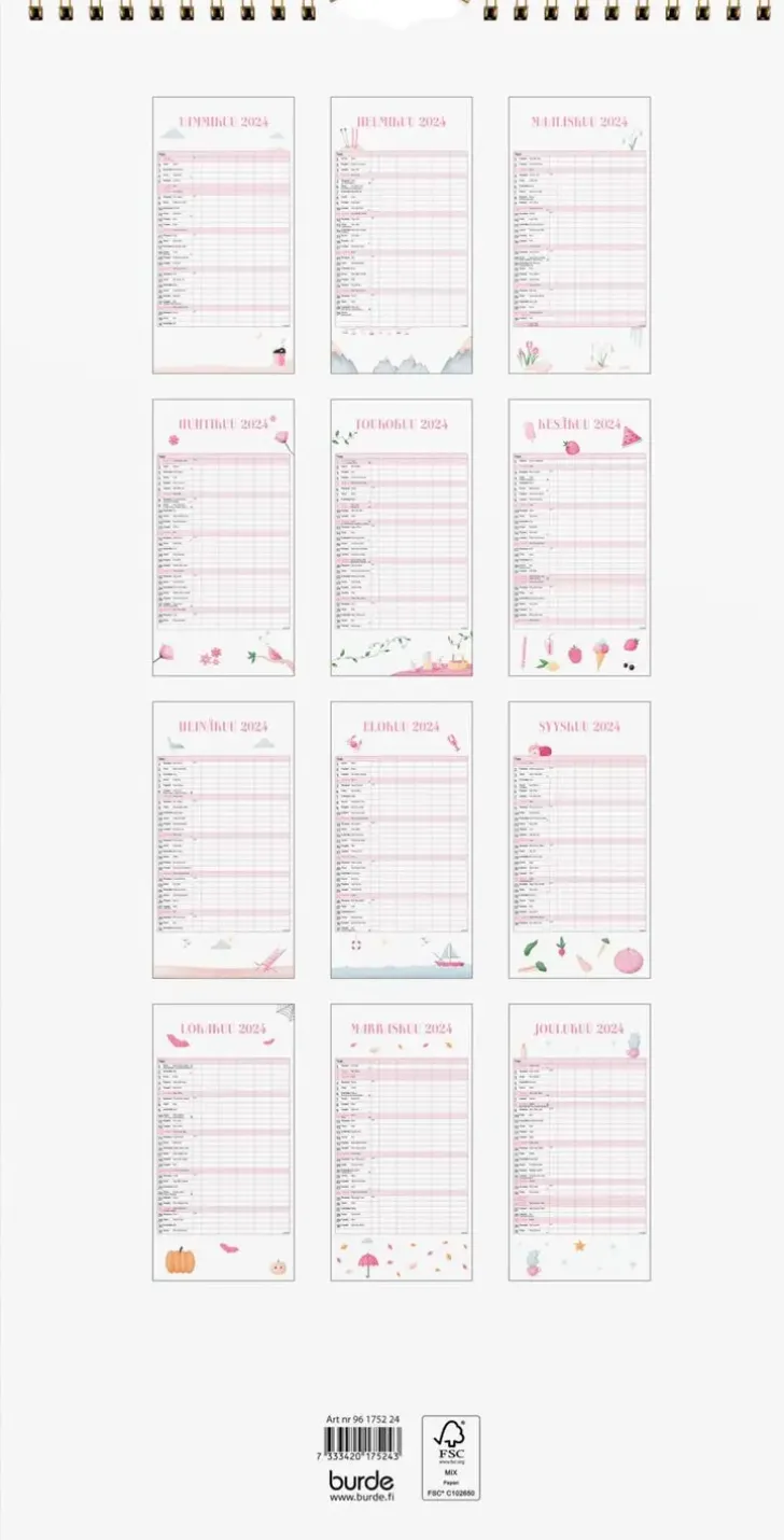 12 Sivua. Seinäkalenteri, Jokaisella Aukeamalla Yksi Kuukausi Ja Viisi Sarakketta. Kalenteri Sisältää Suloisia Kuvituksia, Nimipäivät, Liputuspäivät, Juhlapyhät Ja Kuun Vaiheet. Suomenkielinen. Parikierresidottu. Fsc®. Koko: 220X430 Mm.