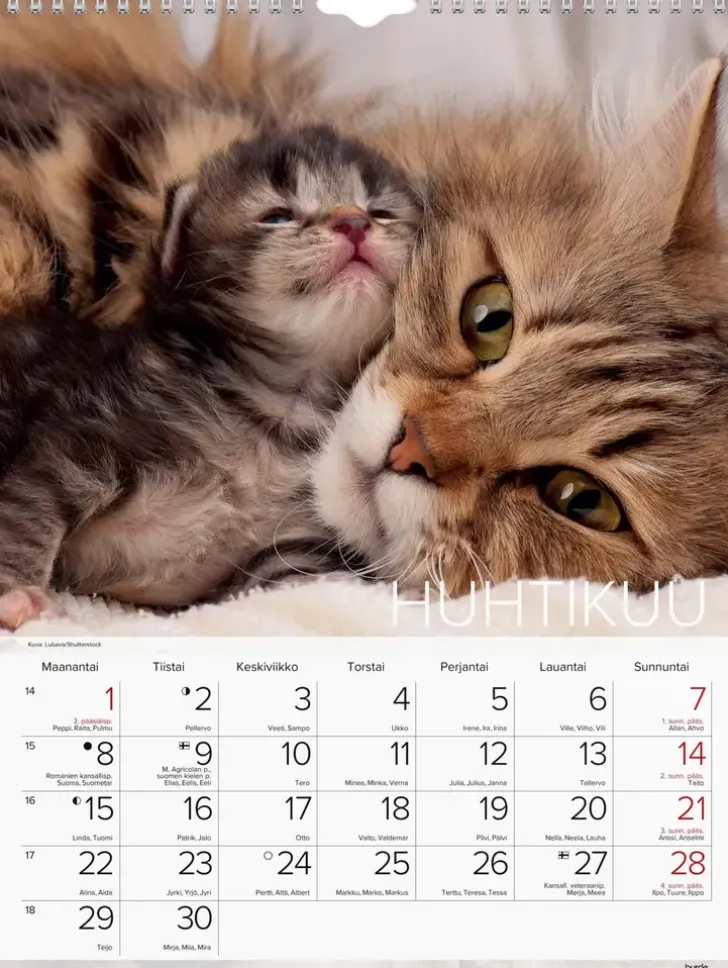 12 Kuvaa Eläinystävistämme. Kalenteri Sisältää Nimipäivät, Liputuspäivät, Kansalliset Pyhäpäivät Ja Kuun Vaiheet. Suomenkielinen. Parikierresidottu. Fsc®. Koko: 295X390 Mm.