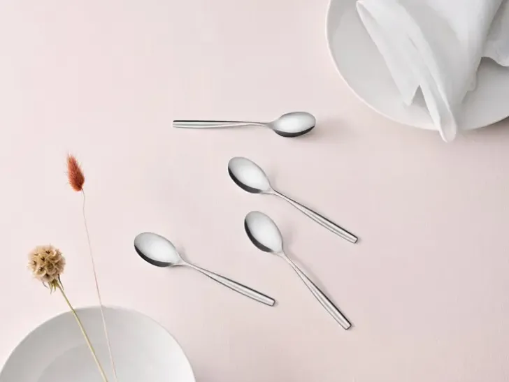 Hienostuneen Carelian Ympärillä Tuntuu Leijuvan Ripaus Juhlatunnelmaa, Mutta Se Sopii Mainiosti Kaunistamaan Myös Tavallista Arkea. Carelia On Varsinainen Klassikko – Yhtä Moderni Ja Miellyttävä Kuin 1963, Jolloin Se Ensi Kerran Esiteltiin. Aterimet Ovat Kiiltävää Ruostumatonta Terästä.