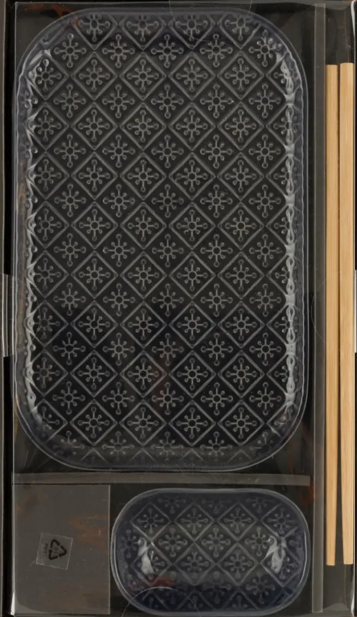 Kolmiosainen Sushi-Tarjoilusetti, Jossa Sushilautanen, Dippilautanen Ja Syömäpuikot. Lautaset Ovat Kivitavaraa Ja Syömäpuikot Bambua. Mitat: Lautanen 22,4 X 14,3 X 1,4 Cm, Kulho 9,6 X 6 X 2,3 Cm Ja Syömäpuikot 24 X 0,7 Cm. Lautaset Voi Pestä Astianpesukoneessa, Syömäpuikot Tulee Pestä Käsin.