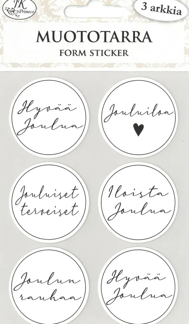 Muototarrat Askarteluun Ja Koristeluun. Pakkaus Sisältää Kolme Arkkia Eli Yhteensä 18 Kappaletta Paperisia Muototarroja. Yhden Tarran Halkaisija On N. 4Cm.