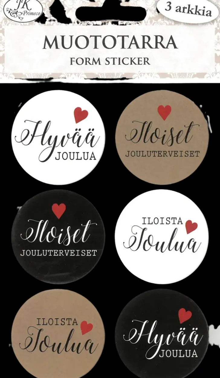 Muototarrat Askarteluun Ja Koristeluun. Pakkaus Sisältää Kolme Arkkia Eli Yhteensä 18 Kappaletta Paperisia Muototarroja. Yhden Tarran Halkaisija On N. 4Cm.