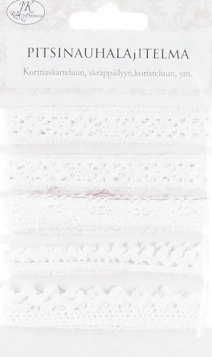 Pakkaus Sisältää Viisi Erilaista Pitsinauhaa, Jokaista Pakkauksessa 1 Metri. Lajitelma Askarteluun, Skräppäilyyn, Paketointiin Ja Koristeluun. Nauhan Leveys N. 1,5Cm.