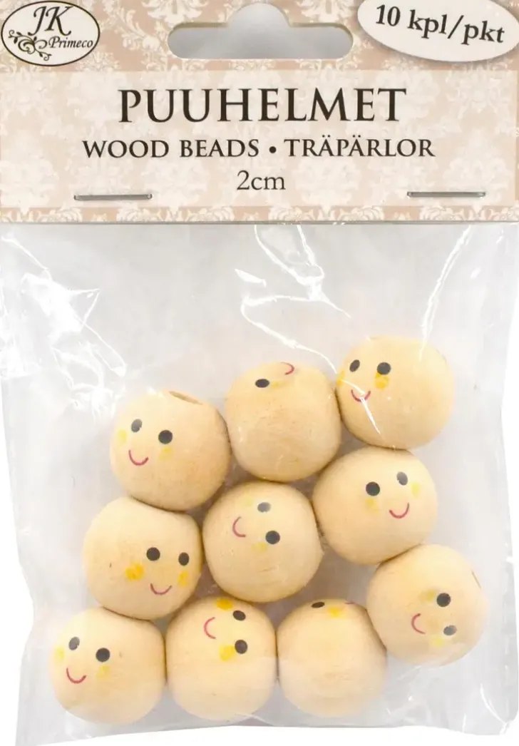 Puuhelmet Askarteluun Ja Koristeluun. Pakkaus Sisältää 10 Kappaletta Puuhelmiä, Joissa Hymynaama. Puuhelmen Halkaisija On N. 2Cm.