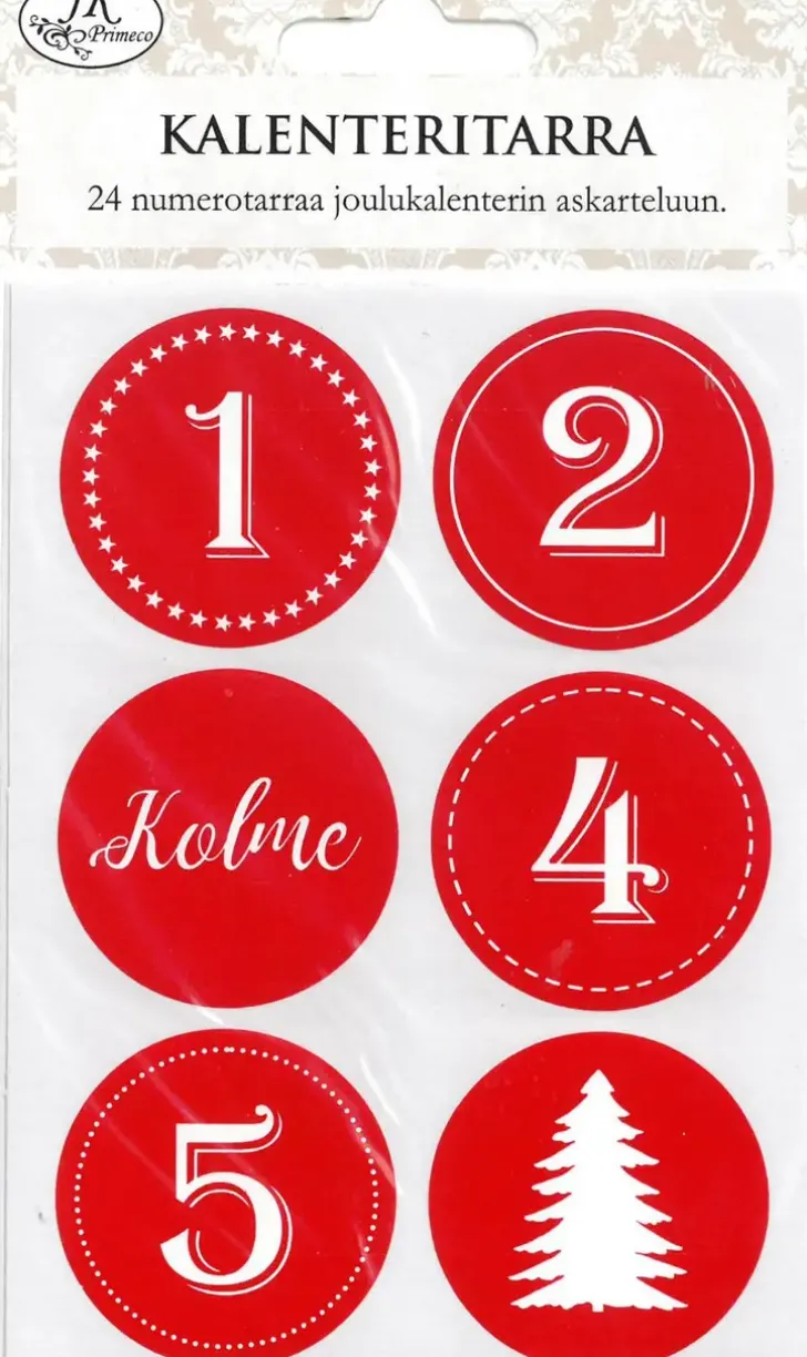 Joulukalenteritarra Joulukalenterin Askarteluun. Pakkauksessa Numerotarrat 1-24. 4 Arkkia/Pkt.