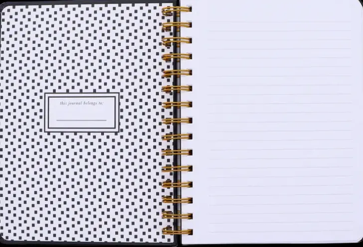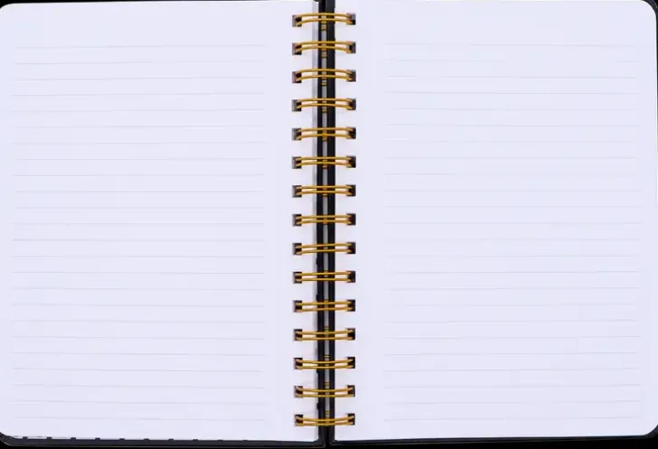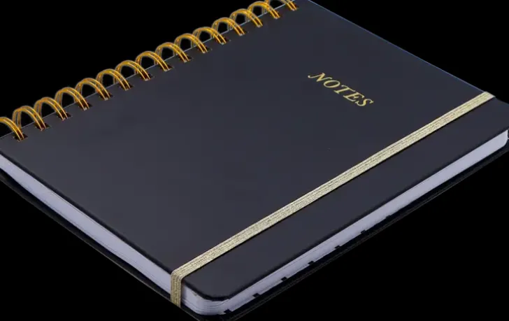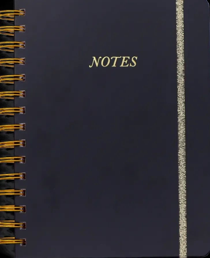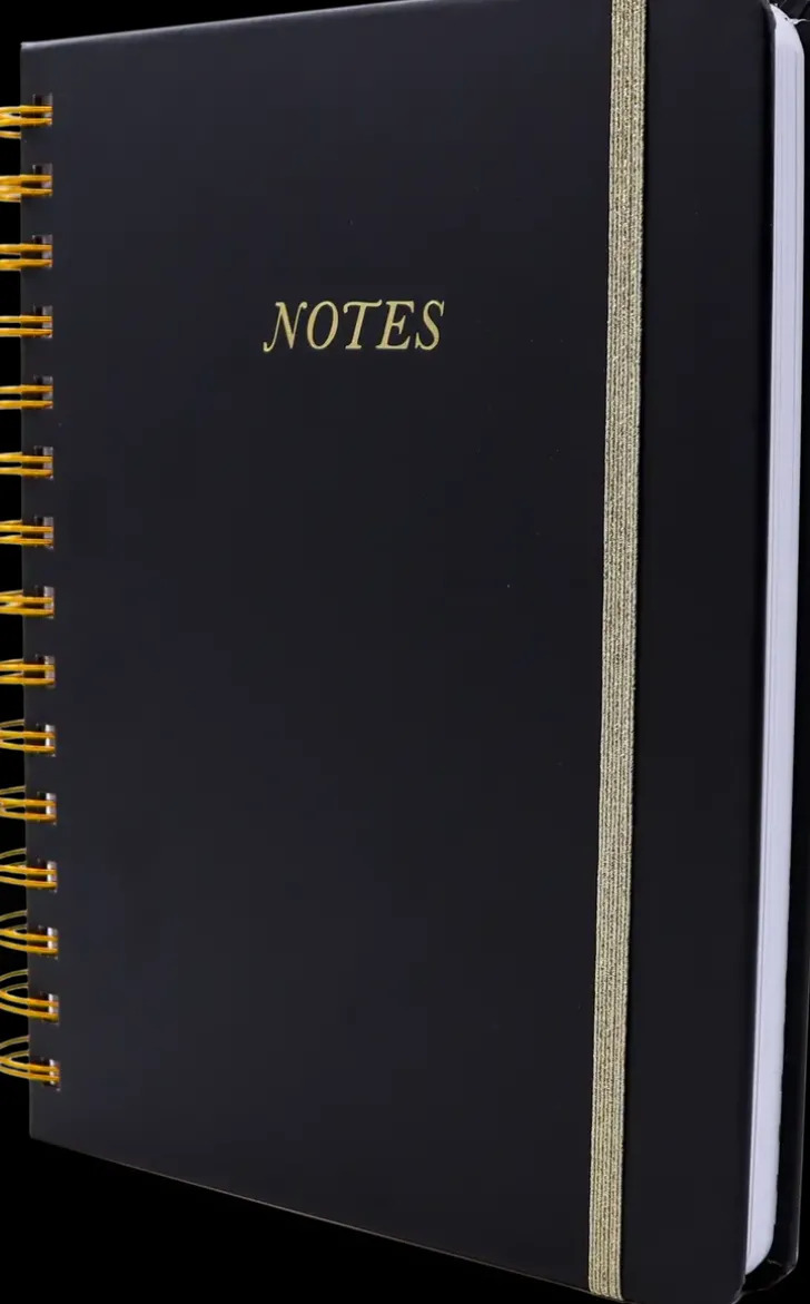 Viivoitettu A5-Kokoinen Kierremuistikirja. 120 Lehteä, Kullansävyiset Yksityiskohdat Ja Kuminauhakiinnitys.