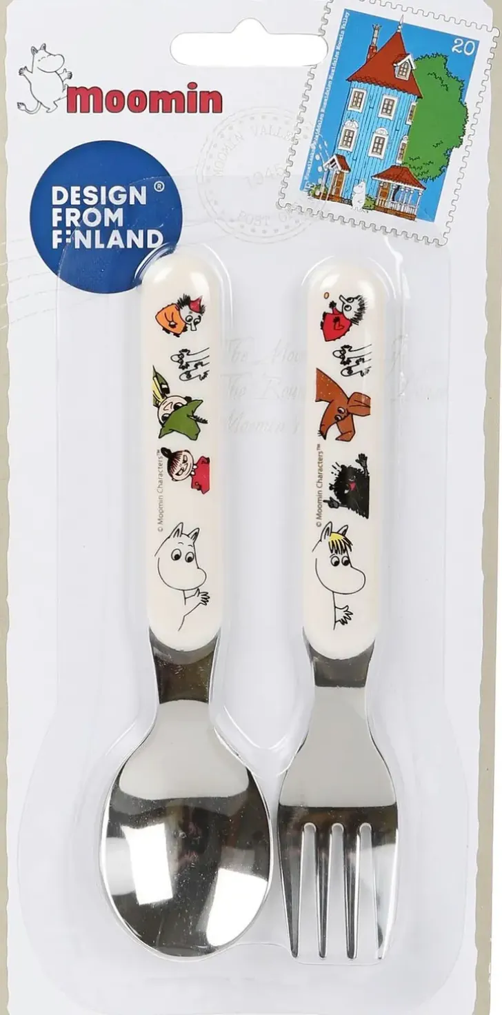 Haarukka Ja Lusikka Perheen Pienimmille. Aterimien Varsissa Näkyvät Muumihahmot. Terästä Ja Muovia.