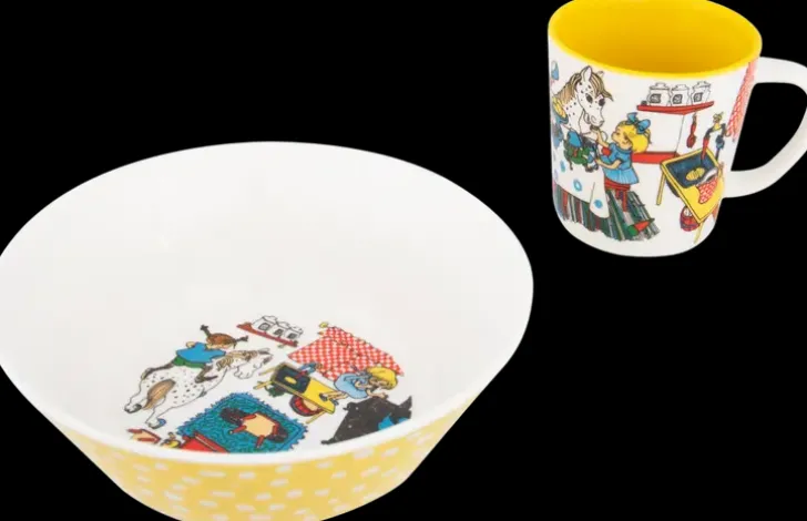 Keraaminen Lastenastiasto Värikkäällä Peppi Pitkätossu -Kuosilla. Astiasto On Pakattu Kauniiseen Laatikkoon, Joka Sopii Tyylillisesti Laatikon Sisältöön. Mukin Vetoisuus 2 Dl. Uunin, Mikron Ja Konepesun Kestävä.