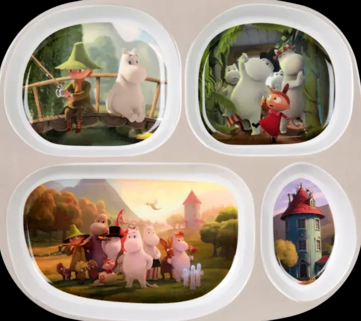 Kätevä Nelilokeroinen Lautanen. Lautasen Muumiaiheinen Kuvitus On 2019 Julkaistusta Muumilaakso Animaatiosta. Sopii Hyvin Perheen Pienimmille Sormiruokailuun. Valmistettu Melamiinista. Käsinpesu Suositeltavaa. Ei Mikroon.