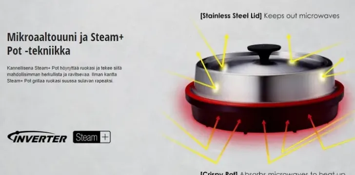 Parhaita Tuloksia Ruoanlaitossa. Huippulaadukas Invertteritekniikkaa Käyttävä Mikroaaltouuni, Jossa Lisäksi Steam+ Pot -Tekniikka.Kannellinen Steam+ Pot Höyryttää Ruokasi Ja Tekee Siitä Mahdollisimman Herkullista Ja Ravitsevaa. Ilman Kantta Steam+ Pot Grillaa Ruokasi Suussa Sulavan Rapeaksi.Voit Myös Höyryttää, Hauduttaa Tai Paistaa Ruokasi Ilman Esilämmitystä. Invertteritekniikan Ansiosta Mikroaaltotehto Kypsentää Ruoat Nopeasti, Kun Taas Grilli Huolehtii Ruskistamisesta Ja Rapeudesta. Tämä Tapahtuu Samanaikaisesti, Mikä Nopeuttaa Ruoanvalmistusta. Pika 30 Toiminnolla Kypsennät Nopeasti Ja Helposti 30 Sekuntia Ilman Lisäasetusten Määrittämistä. Lisää Aikaa -Toiminto Tarjoaa Joustavuutta Keittiöön. Jos Automaattisen Ohjelman Asettama Aika Ei Riitä Ja Haluat Kypsentää Ruokaa Pidempään, Lisää Aikaa -Toiminnolla Voit Asettaa Haluamasi Lisäajan.