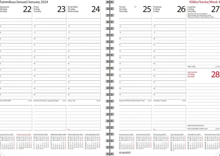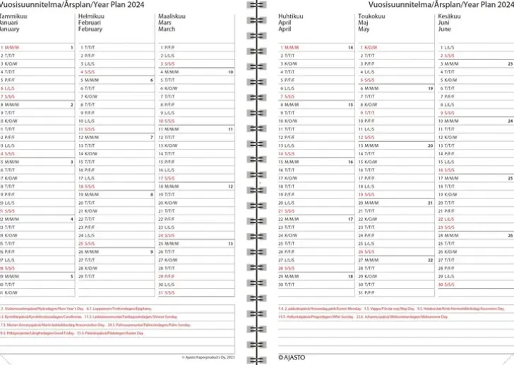 Perinteinen Wega-Vuosipaketti, Joka Sopii Kaikkiin Ajaston A5-Kansiin. Koko 148 X 210 Mm (A5); Parikierresidottu; Kielisyys: Suomi, Ruotsi, Englanti; Aukeamalla Viikkonäkymä; Fsc®-Sertifioitu Tuote.