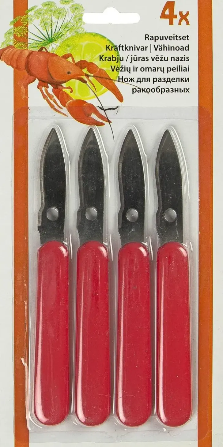 Lyhyt Ja Tukeva Terä, Jolla Ravun Kuoret Saa Helposti Avattua. Veitsen Terässä Olevalla Pienellä Reiällä Saa Katkaistua Saksien Päät, Jotta Pääsee Imemään Liemen Ja Syömään Niiden Sisällä Olevan Lihan. Rapuveitsi, Jotta Pääsisit Käsiksi Tillintuoksuiseen Nautintoon. Käsinpesu.