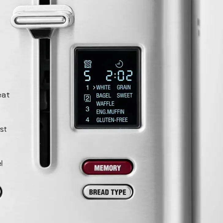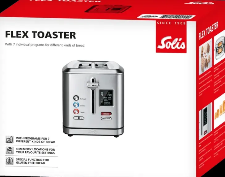 Teräksisellä Solis Flex Toaster Paahtimella Paahdat Parhaat Leivät Päivän Jokaiseen Hetkeen. Laitteessa On Seitsemän Paahto-Ohjelmaa Vaaleaa Tai Täysjyväleipää, Bageleita, Vohveleita, Muffinsseja, Pullia Ja Gluteenittomia Leipiä Varten. Voit Ohjelmoida Ja Tallentaa Suosikki Paahtoasetuksesi. Paahtoaste On Säädettävissä Ja Lisäksi Laitteesta Löytyy Sulatus-, Uudelleenlämmitys- Sekä Keskeytystoiminnot. Valaistut Toimintonäppäimet Lisäävät Käyttömukavuutta Ja Selkeältä Lcd-Näytöltä Näet Jäljellä Olevan Paahtoajan. Myyntipakkaukseen Kuuluvan Sämpylätelineen Avulla Lämpenevät Croissantit Aamiaispöytään Hetkessä. Irrotettava Murutarjotin Helpottaa Laitteen Puhdistusta. Takuu 6 Vuotta.
