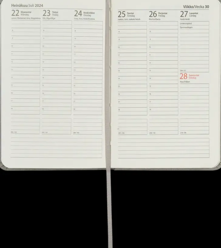 Taskukalenteri Kuminauhalla Ja Kirjanmerkkinauhalla. Koko: A6. Kielisyys: Suomi, Ruotsi. 192 Sivua.