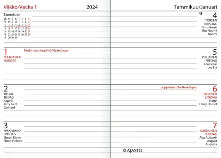 Kokonsa Ansiosta Mahtuu Taskuun Kuin Taskuun. Koko 72 X 102 Mm; Leatherette-Kannet; Sidottu; Kielisyys: Suomi, Ruotsi; Aukeamalla Viikkonäkymä; Päiväkirja 51/2023 – 1/2025; Vuosisuunnitelma 2025; Suomalaiset Ja Suomenruotsalaiset Nimipäivät; Kansalliset Vapaapäivät Luettelona; Liputuspäivät Suomessa; Vuosiruudukko; Muistiinpanotilaa.