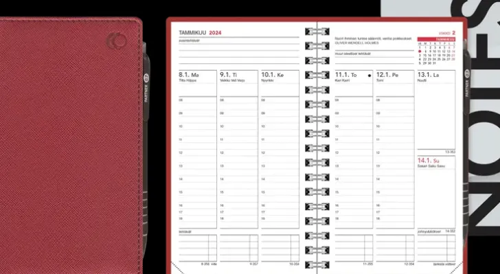 Sivukoko 87 X 153 Mm, Viikot 42/2023-1/2025, Kuukausi- Ja Projektisuunnittelusivut 2024 Ja 2025, Monikäyttöinen Viitelomakkeisto. Aukeamalla Viikko, Tunnit 8-18, Liputuspäivät, Kansalliset Pyhät Aukeamilla Ja Luettelona, Nimipäivät. Wiresidottu, Kulmaperforoitu. Huippulaadukas Keinonahkakansi On Aina Pehmustettu, Sisävuorattu Ja Reunaommeltu. Suomenkielinen. Keinonahkakansissa On Kalenterin Lisäksi Mukana Myös Siirrettävä Notes-Muistio. Kansia Voi Käyttää Useamman Vuoden Niiden Kestävän Rakenteen Ansiosta.