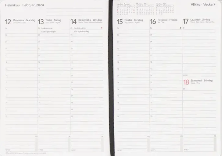 A5 Classic Pöytäkalenteri On Lankasidottu, Trendikkään Värisillä Ja Pehmustetuilla Keinonahkakansilla Päällystetty Kirjamallinen Kalenteri. Merkkinauhan Avulla Haluttu Viikko Löytyy Nopeasti. Irrallinen Muistio Takakannen Sisätaskussa, Jota Voi Käyttää Myös Kuittien Ja Papereiden Säilytykseen. Valmistettu Fsc-Sertifioidusta Paperista. · Lankasidottu · Sivukoko A5 – 148 X 210 Mm · Kaksikielinen: Suomi, Ruotsi · Viikot 45/2023 – 52/2024 · Kuukausikalenterit 2024 Ja 2025 · Vuosikalenterit 2024 Ja 2025 · Avattava Vuosisuunnitelma 2024 · Nimipäiväkalenteri 2024 · Liputuspäivät 2024 · Kansalliset Pyhäpäivät 2024 · Ulkomaan Suuntanumerot · Tehtäväluettelot · 8-Sivuinen Maailmankartasto ·