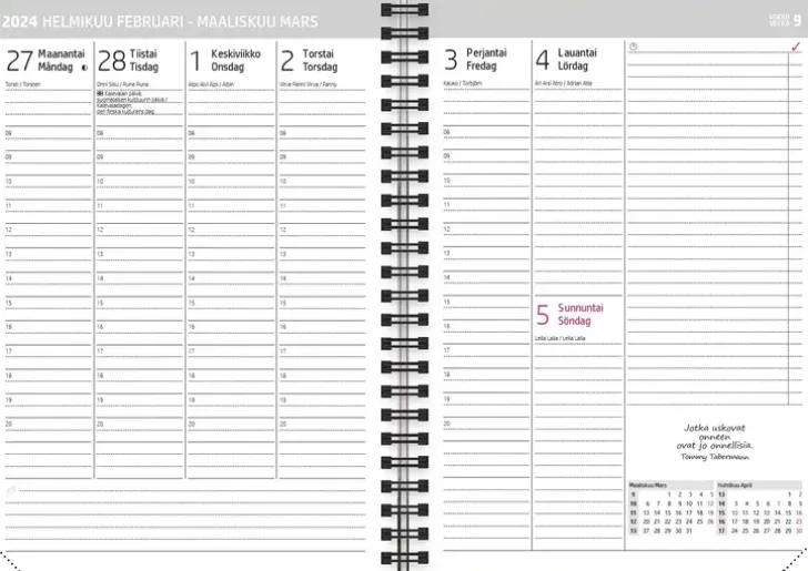 Tommy Tabermannin Runot Ovat Pääosassa Tässä Vuoden 2024 Kalenterissa. Seesteinen Kansitaide Luo Rauhallisen Tunnelman. Viikkonäkymässä On Riittävästi Tilaa Muistiinpanoille Ja Vaikkapa Omille Runoillesi! Tässä Kartonkikantisessa Kierresidotussa Mallissa On Kaksikielinen Viikkonäkymä (Suomi Ja Ruotsi), Ja Se Pysyy Pöydällä Avattuna. Suomalaiset Nimi- Ja Juhlapäivät. Sisältää Vuosisuunnitelman, Liputuspäivät, Suomenkieliset Nimipäivät Ja Runsaasti Viivoitettua Muistiinpanotilaa Ja Tehtävälistoja. Valmistettu Fsc-Sertifioidusta Paperista.