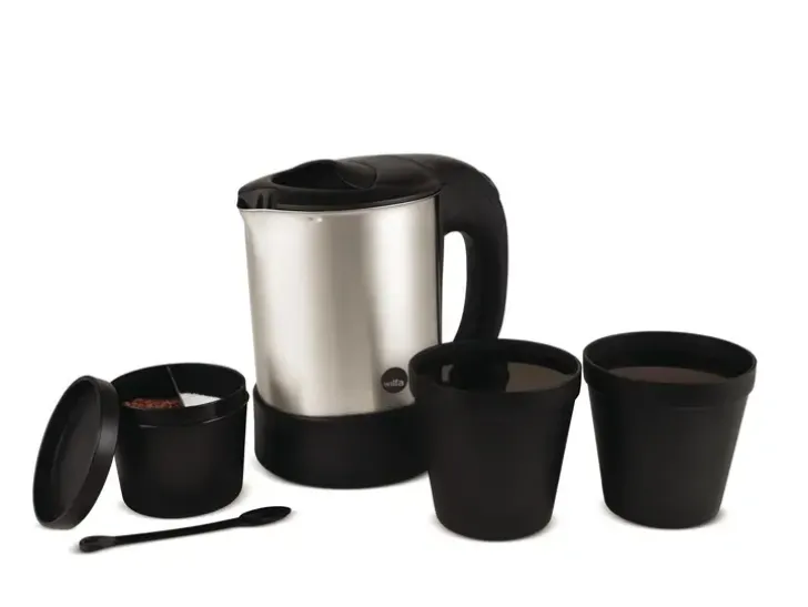 Käytännöllinen Pieni Matkavedenkeitin Korkealaatuisesta Ruostumattomasta Teräksestä. Teho 1000 Wattia Ja Tilavuus 0,5 Litraa. Vedenkeittimessä On Piilotettu, Huomaamaton Lämpövastus Sekä Irrotettava Kansi, Joten Se On Helppo Puhdistaa. Keittimessä Ylikuumenemissuoja Ja Merkkivalo. Kätevä Matkalle – Jännitteen Voi Säätää 120/230 Volttiin. Mukana Matkasetti, Jossa Kaksi Kuppia, Lusikat Sekä Pieni Säiliö, Jossa On Helppo Kantaa Esimerkiksi Kahvia Ja Sokeria Mukana.